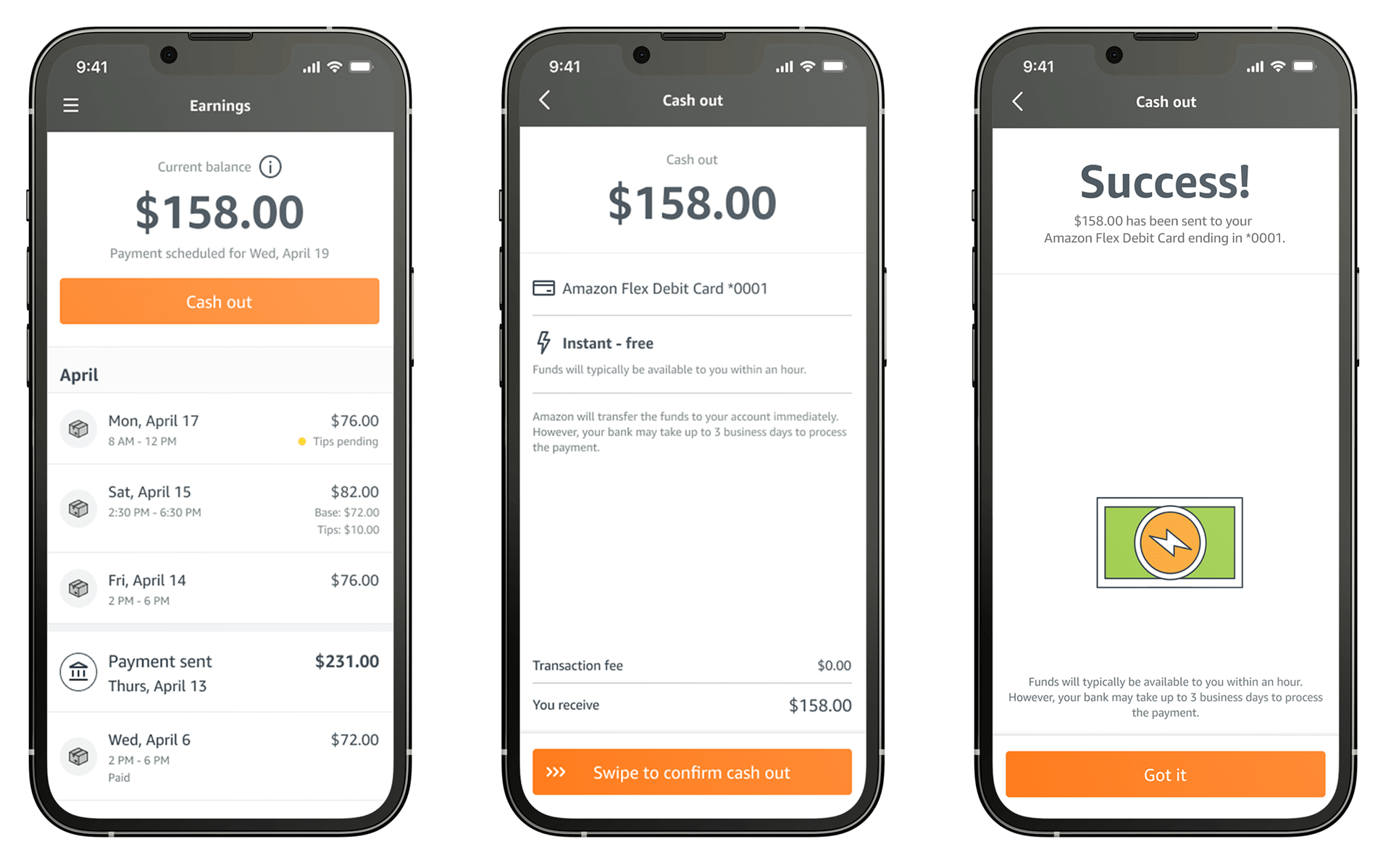 Your earnings are automatically added to your available Amazon Flex Cashout balance shortly after the end of your block time, while tip-eligible blocks are added 27 hours after block completion. If you want your earnings instantly, you can cash them out to your Amazon Flex Debit Card for instant access to funds at no cost, or to any other debit card for a 50-cent fee. If you’d prefer your earnings delivered to a bank account, you also have an option to cash them out to your bank account for same or next business day availability at no cost, or get your earnings to your bank faster for a 50-cent fee. You can use Amazon Flex Cashout at any time by going to Earnings > Cashout > Select your payment speed.