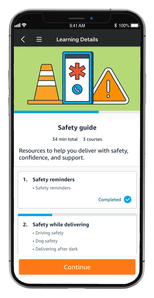 Learning paths are available on three key topics: Amazon Flex basics, safety, and delivering. They include useful guidance, expectations, and interactive elements, such as short questions, that can help you remember important details. You can view the content continuously, or pause and return to the same piece of content that you left.