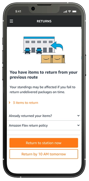 At the end of your route, the app will notify you of any packages that need to be returned and provide two convenient options: "Return to station now" or "Return by 10 AM tomorrow." If you choose to return immediately, the app will automatically provide you with navigation back to the delivery station. If you select to return the next day, a reminder will be automatically created in your itinerary to help you remember to complete the return the following morning. All returns must be scanned using the Amazon Flex app by 10 AM.