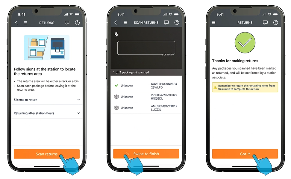 To help Amazon Flex delivery partners handle package returns efficiently and ensure undelivered packages get back to the station on time, the Amazon Flex app provides several useful features. These features guide you through the return process step-by-step, including confirming when you will return the undelivered package, as well as how to scan returned packages at the delivery station. Here are some of the key features that can help you complete your package returns quickly, so you can get back to your day.