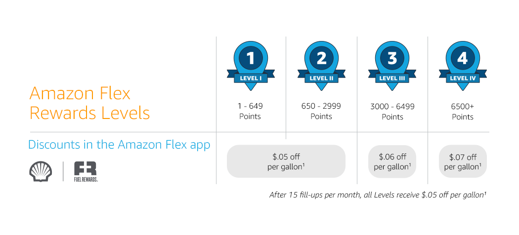 The exact discount you’ll receive is based on your Amazon Flex Rewards Level. Amazon Flex Rewards Level 4 is eligible for seven cents off per gallon,1 Rewards Level 3 is eligible for six cents off per gallon,1 and Rewards Levels 1 and 2 are eligible for five cents off per gallon.1